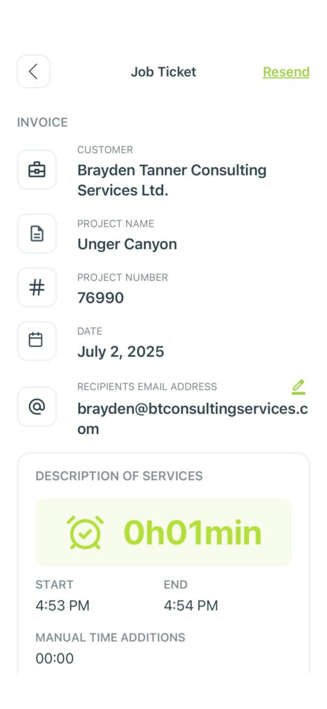 To share a past ticket with new recipients, start by opening the job from the History tab. Tap the pencil icon next to the existing email address, enter any new addresses, then press save. Once updated, tap Resend to deliver the job ticket to everyone listed.