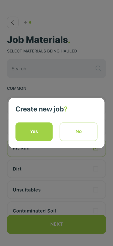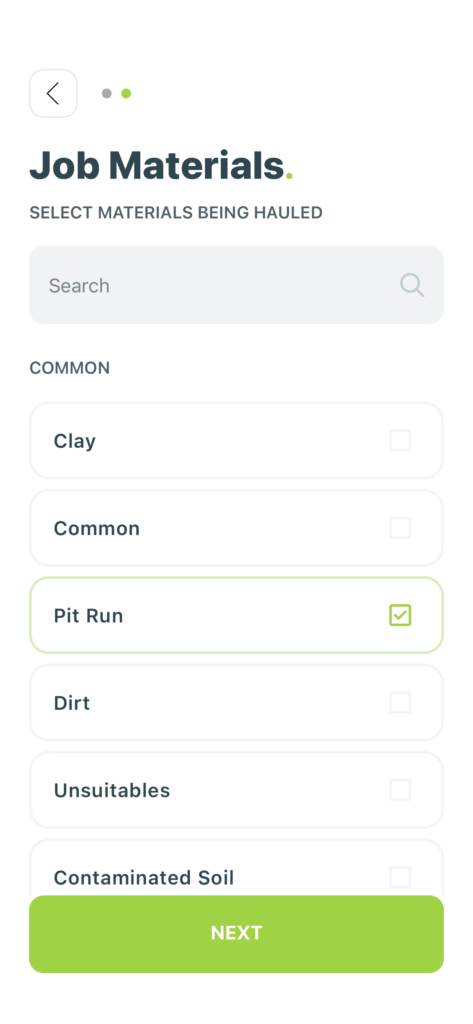 Choose the material or materials being hauled by tapping the checkbox next to each one. Once you’ve made your selections, tap Next to continue.
