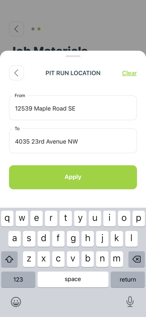After selecting a material, tap it to open the location entry screen. Fill in the pickup (from) and drop-off (to) addresses, then tap Apply to save.
